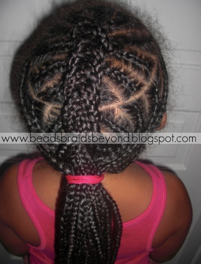 A's three cornrowed ponytails style has been in for a week now and between soccer practice and swimming the cornrows have gotten quite fuzzy. I switched the style up a little bit on Saturday (below) by grabbing the top section and braiding it down then placing all of the braids in to one ponytail. Today I decided to go ahead and start taking some of the braids out so I removed all the braids from the 2 ponytails in the back but left the cornrows in. Once again, I braided the top section straight down the middle but this time I split it in two and tied them off with a cute ponytail holder. I wanted the two strand twists to have texture so I didn't brush the hair out, I left the braid-out pattern there, added a little Bee Mine Curly Butter, twisted and I was all done! I may go ahead and take the rest of the style down tonight after soccer practice. Stay tuned...